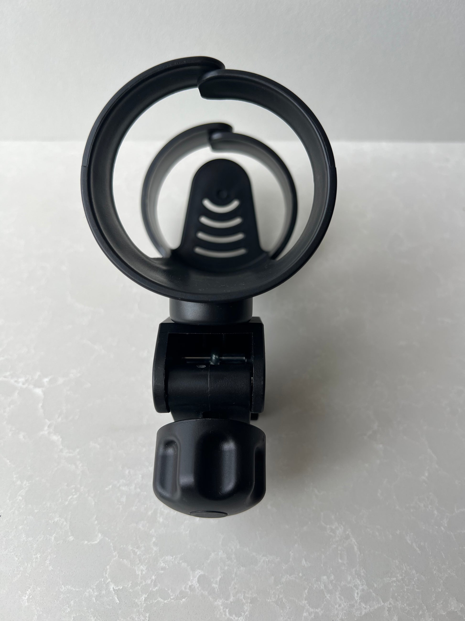 This adjustable cup holder features a 360° rotating mount and a flexible grip that fits most standard cups and bottles. Designed to stay snug during motion, it holds smaller items securely and expands to fit larger drinks as needed. The universal clamp easily attaches to wheelchairs, walking frames, or prams without tools.